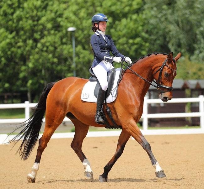 Caroline enjoys hacking and goes out both alone and in company, she is safe on the roads in traffic and in open spaces. Caroline enjoys pole work for variation and is turned out with mares and geldings. Caroline is easy to handle in all ways and is well behaved for the farrier, clipping, bathing, loading, dentist etc. She travels well in a 3.5 and 7.5 tonne lorry and happily stands on the lorry at a competition, whether alone or with a friend. Caroline is impeccably behaved at stay away shows and doesn't need to do arena walks. She is not phased by the biggest of competition environments and always looks after her younger jockey and always tries her best.